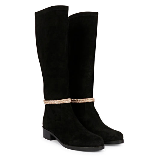 Saint Marisa Golden Cord String Black Stretch Suede Long Boots