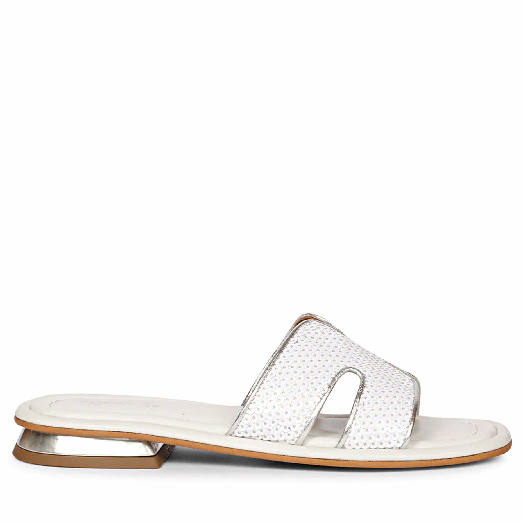 Show off your summer styling with our radiant accessory flats. Step into paradise with our white leather slides! The sequin embellished leather and low heel add playful details. Perfect addition to any summer outfit!