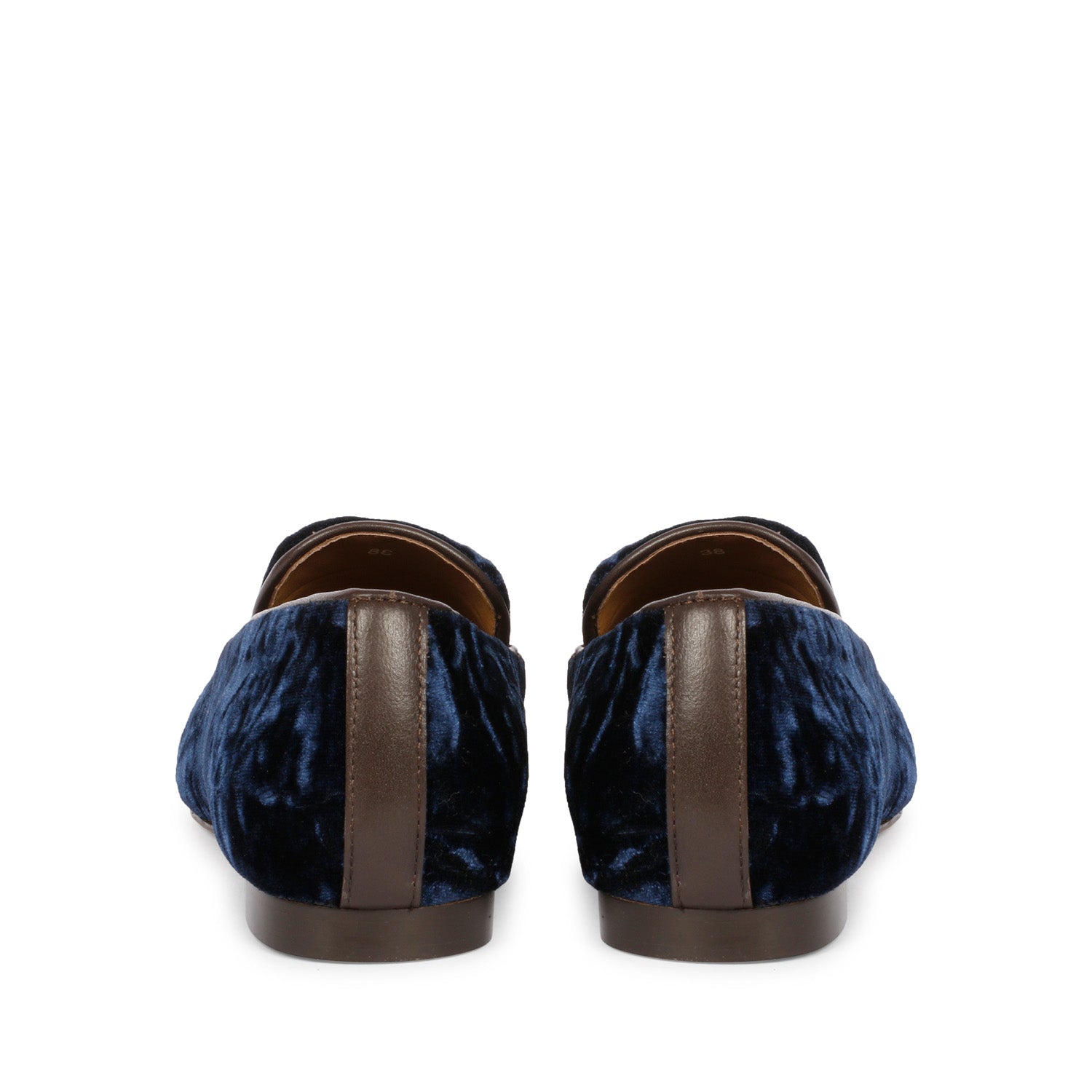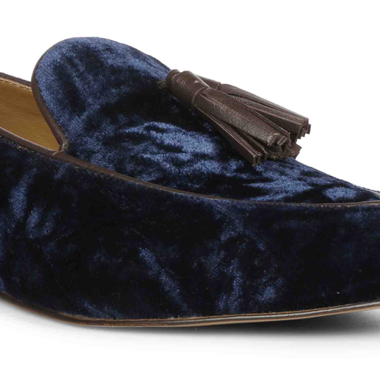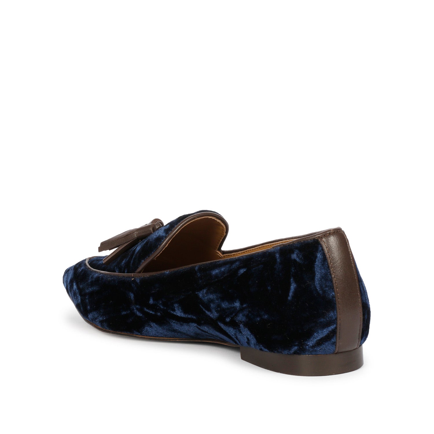 Simona moccasins feature blue velvet/brown leather upper, natural leather lining, padded leather sock & tunit sole.